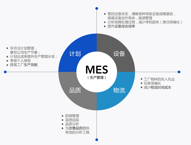 管理生產(chǎn)活動的所有行為,包含 生產(chǎn)計劃,生產(chǎn)實績,生產(chǎn)工藝,品質(zhì)管理,品質(zhì)追蹤,設備管理,倉儲管理,能源管理等;