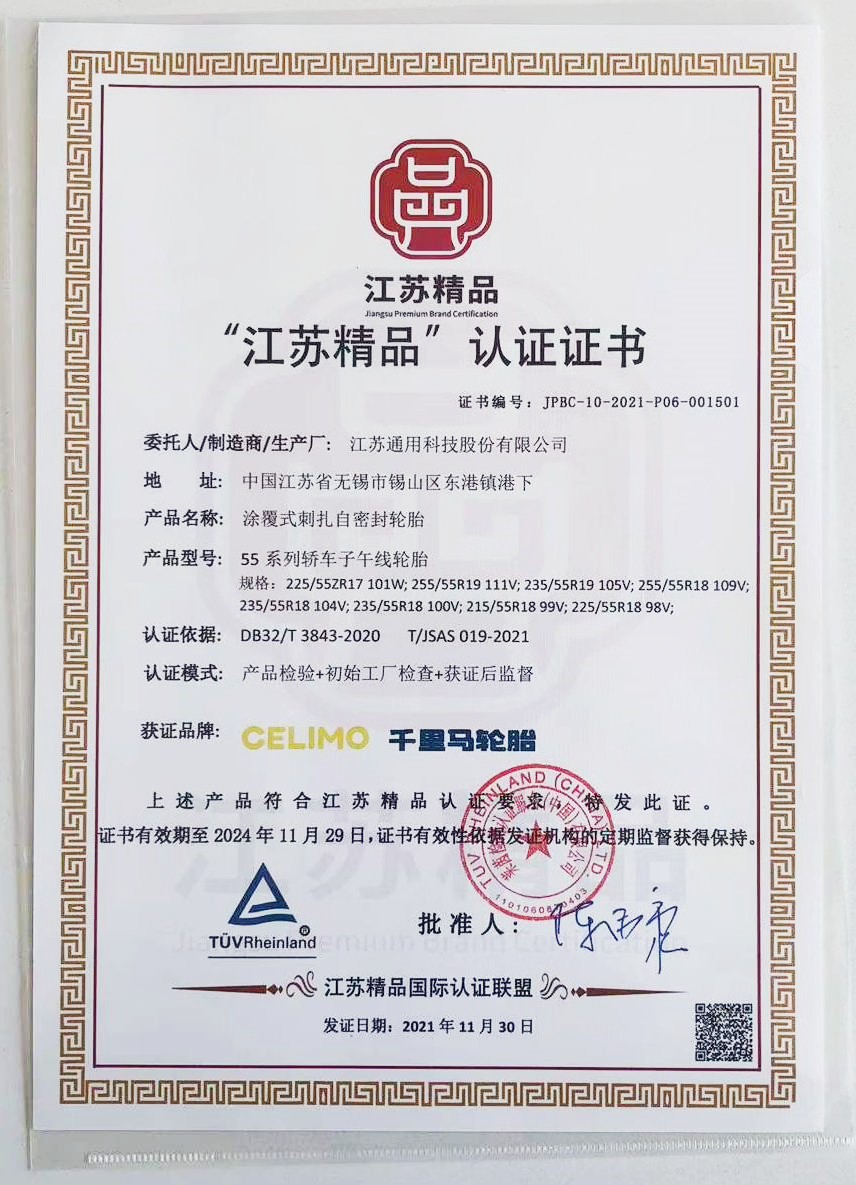 近日,通用股份旗下千里馬品牌涂覆式刺扎自密封輪胎,榮獲 江蘇精品認證。通用股份也是本次全省唯一榮獲江蘇精品認證的輪胎企業。
