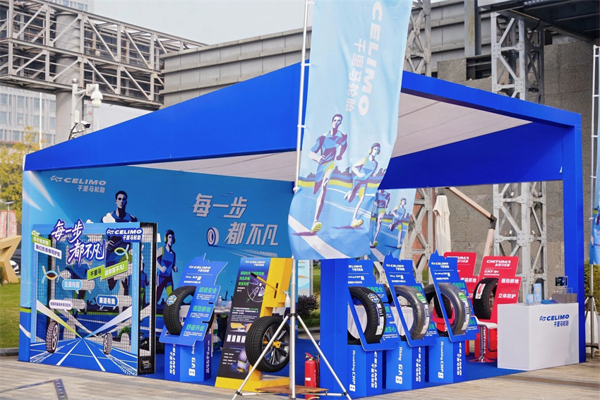 賽場之外,千里馬輪胎精心打造的品牌互動區,則成為了另一片人潮涌動的焦點。在科技感十足的藍色展臺中,一場沉浸式的感官盛宴正等待著每一位訪客。